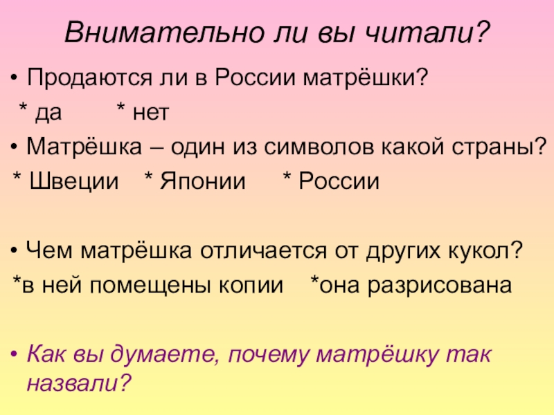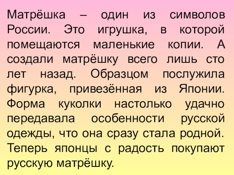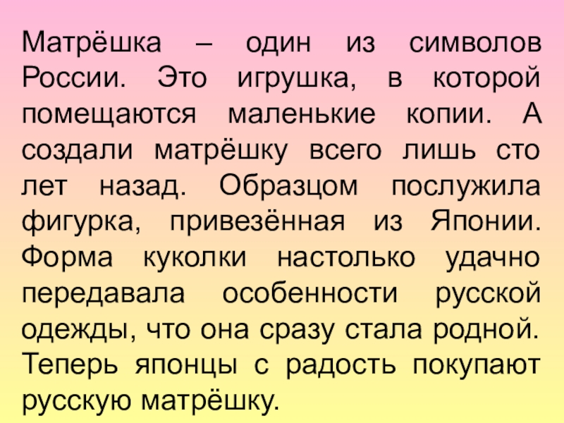 маленькие копии. А создали матрёшку всего лишь сто лет назад. Образцом послужила фигурка, привезённая из Японии. Форма куколки настолько удачно передавала особенности русской одежды, что она сразу стала родной. Теперь японцы с радость покупают русскую матрёшку.