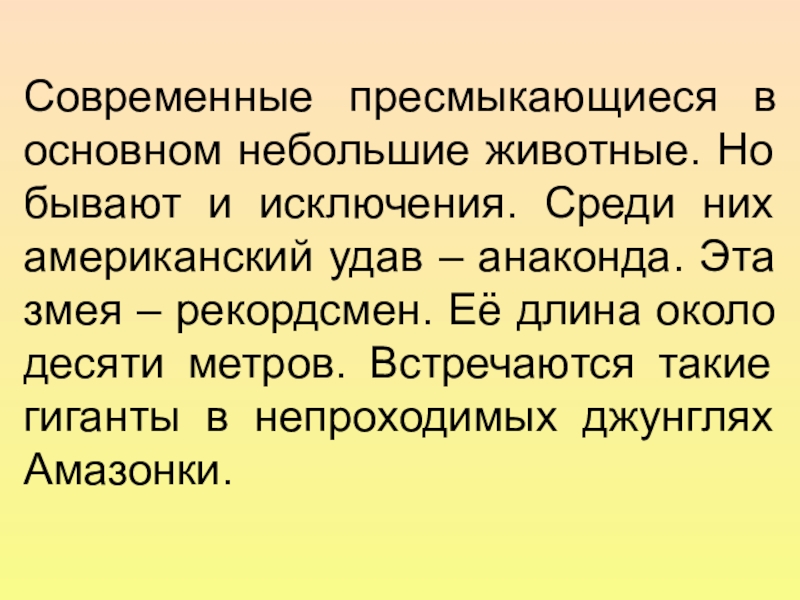 Слайд 9Современные пресмыкающиеся в основном небольшие животные. Но бывают и исключения. Среди
