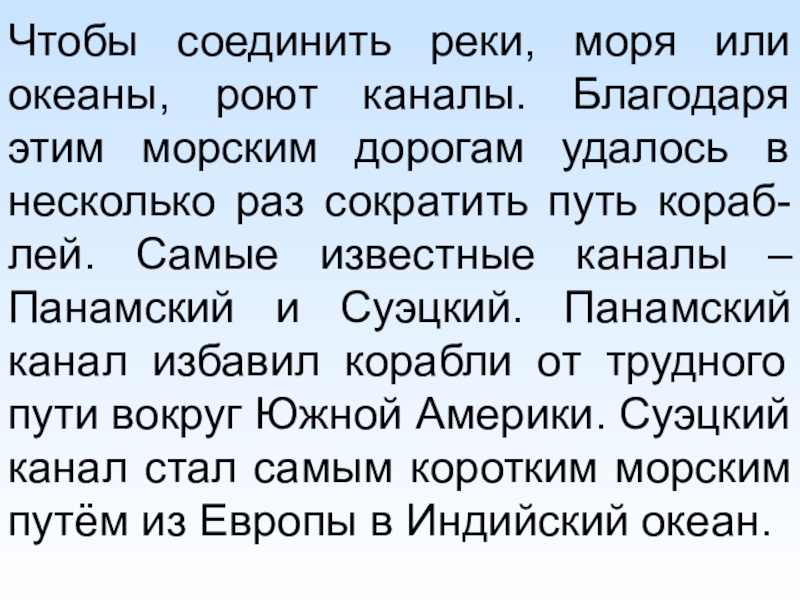 дорогам удалось в несколько раз сократить путь кораб-лей. Самые известные каналы – Панамский и Суэцкий. Панамский канал избавил корабли от трудного пути вокруг Южной Америки. Суэцкий канал стал самым коротким морским путём из Европы в Индийский океан.