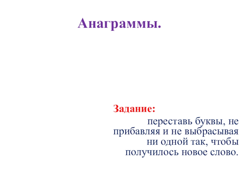 Анаграммы. Задание: переставь буквы, не прибавляя и не выбрасывая ни одной так, чтобы получилось новое слово.