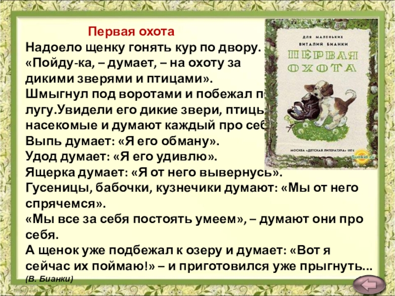 http://nsc.1september.ru/article.php?ID=200800403 В.Сутеев текст, В.Бианки «Первая охота»