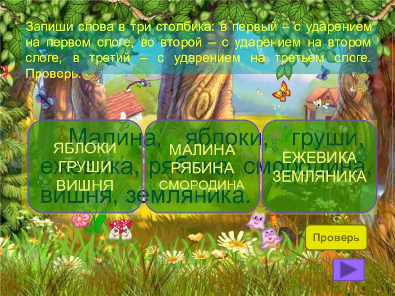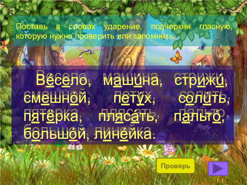 Вéсело, машúна, стрижú, смешнóй, петýх, солúть, пятёрка, плясáть, пальтó, большóй, линéйка.