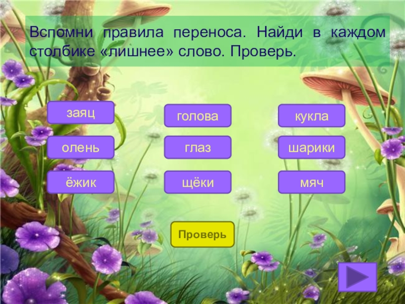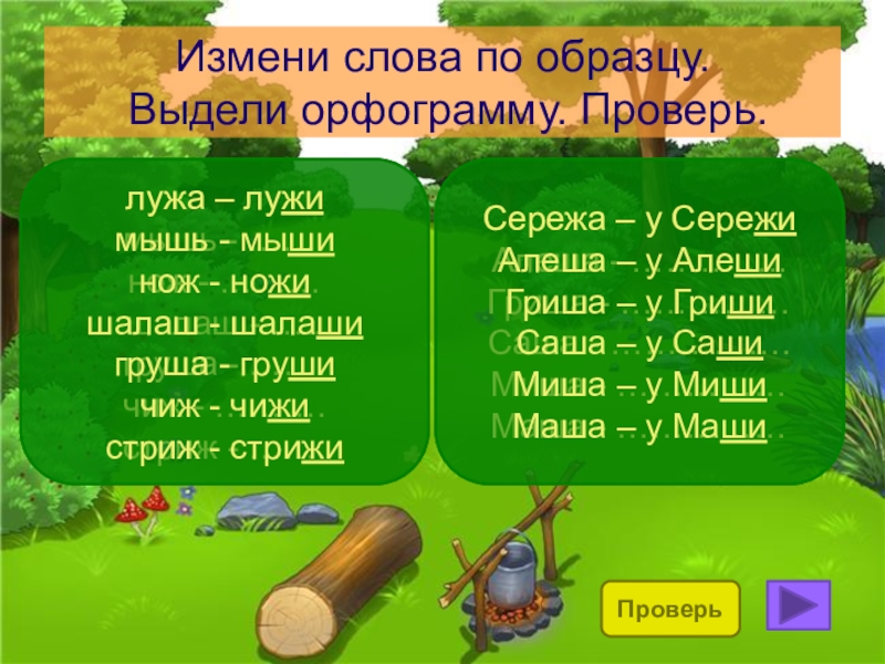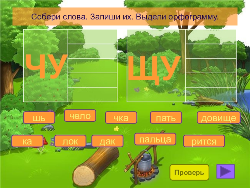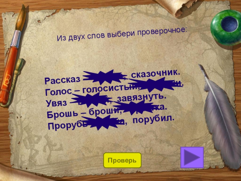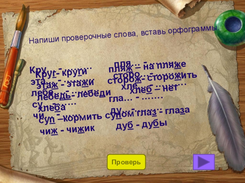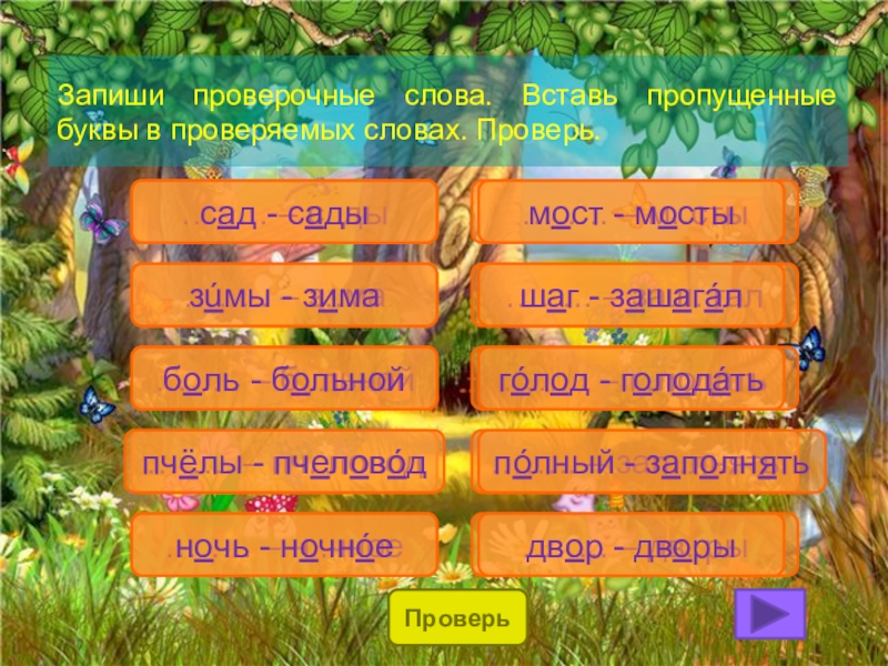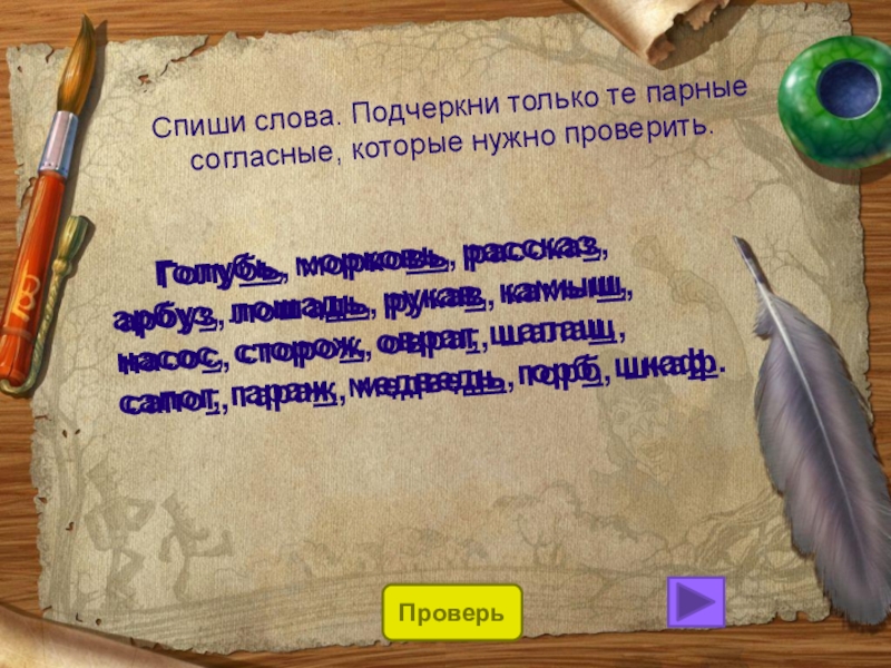 Голубь, морковь, рассказ, арбуз, лошадь, рукав, камыш, насос, сторож, овраг, шалаш, сапог, гараж, медведь, горб, шкаф.