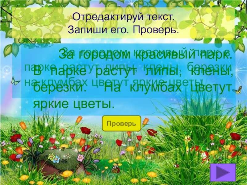 За городом красивый парк. В парке растут липы, клены, березки. На клумбах цветут яркие цветы.