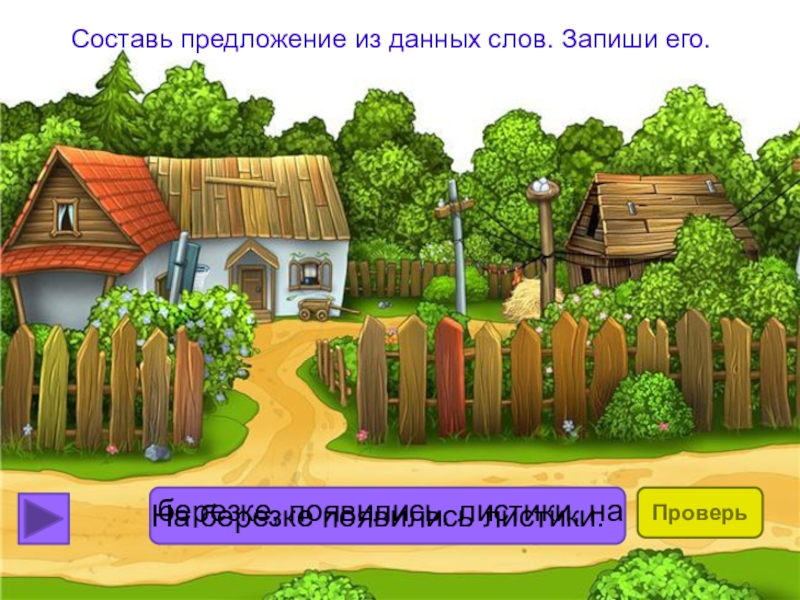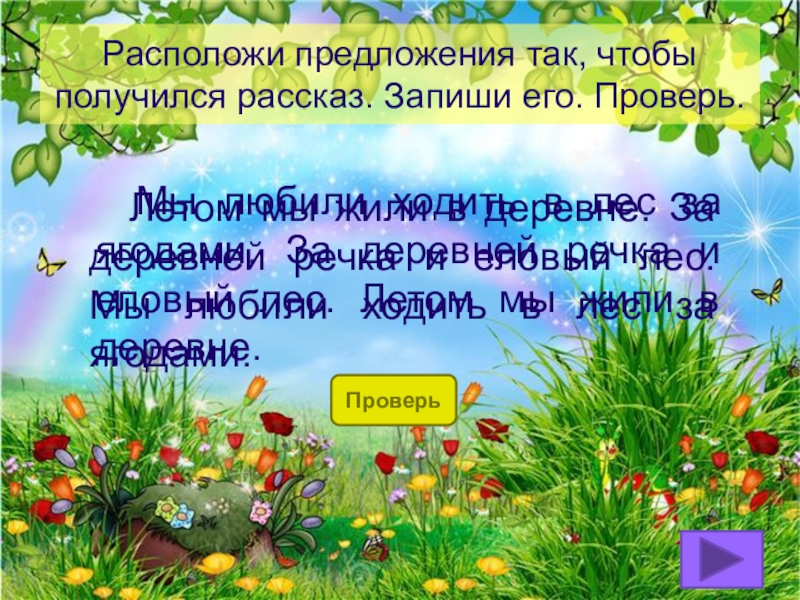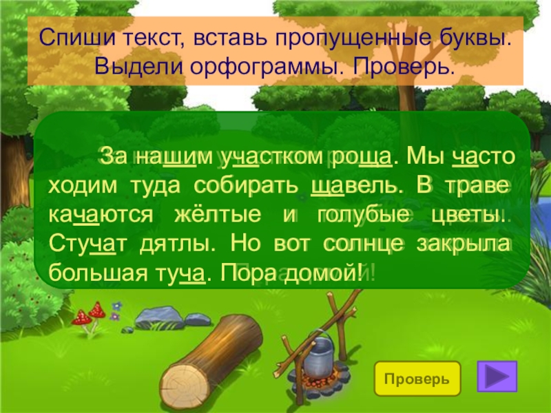 За нашим участком роща. Мы часто ходим туда собирать щавель. В траве качаются жёлтые и голубые цветы. Стучат дятлы. Но вот солнце закрыла большая туча. Пора домой!