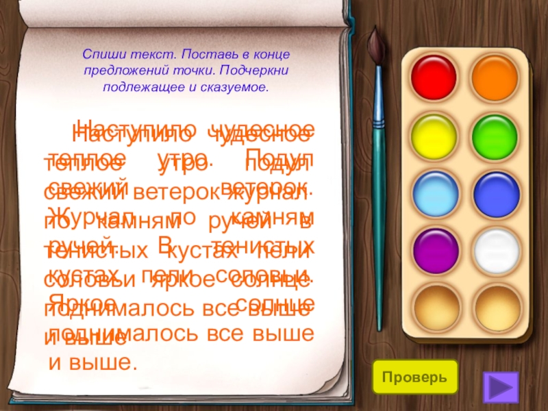 Наступило чудесное теплое утро. Подул свежий ветерок. Журчал по камням ручей. В тенистых кустах пели соловьи. Яркое солнце поднималось все выше и выше.