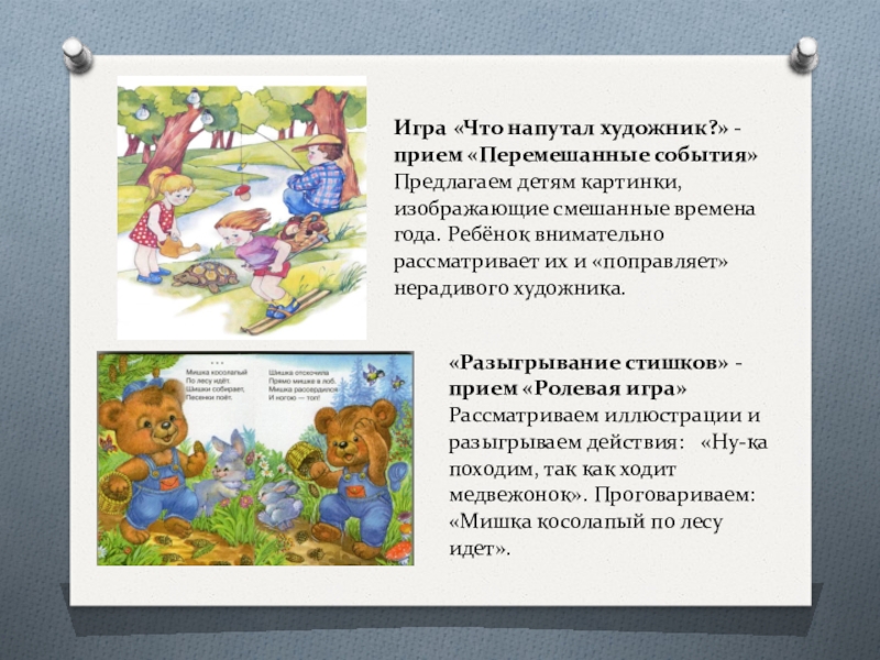 Игра «Что напутал художник?» - прием «Перемешанные события» Предлагаем детям картинки, изображающие смешанные времена года. Ребёнок внимательно рассматривает их и «поправляет» нерадивого художника.