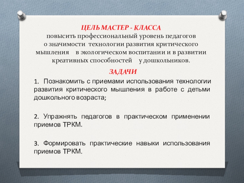 2. Упражнять педагогов в практическом применении приемов ТРКМ.