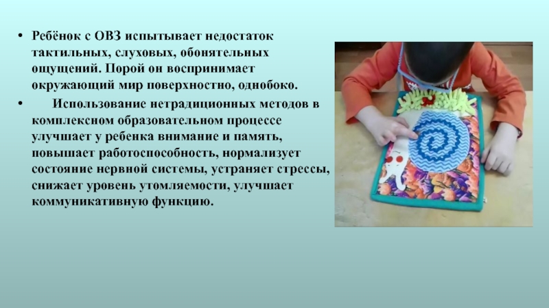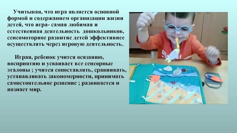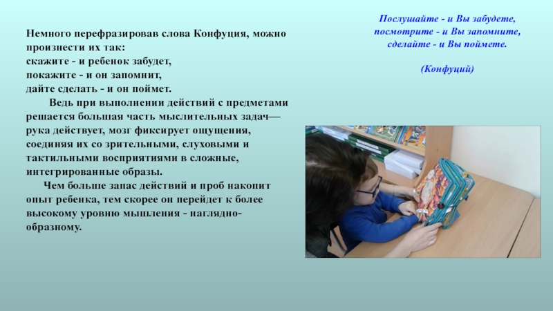 Ведь при выполнении действий с предметами решается большая часть мыслительных задач— рука действует, мозг фиксирует ощущения, соединяя их со зрительными, слуховыми и тактильными восприятиями в сложные, интегрированные образы.