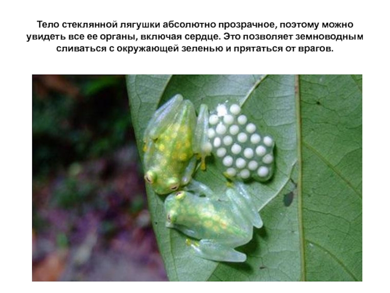 Слайд 33Тело стеклянной лягушки абсолютно прозрачное, поэтому можно увидеть все ее органы,