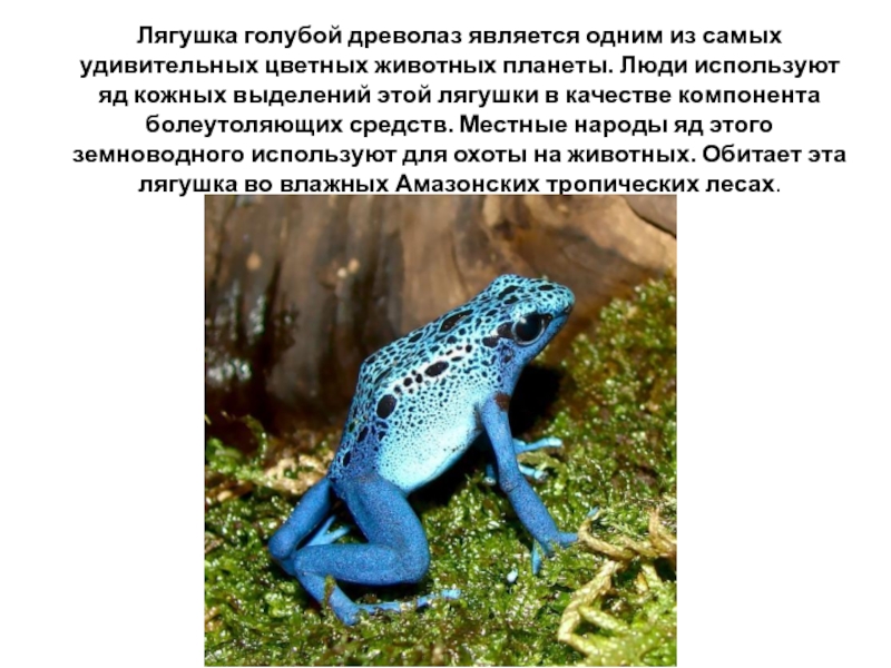 Слайд 15Лягушка голубой древолаз является одним из самых удивительных цветных животных планеты.
