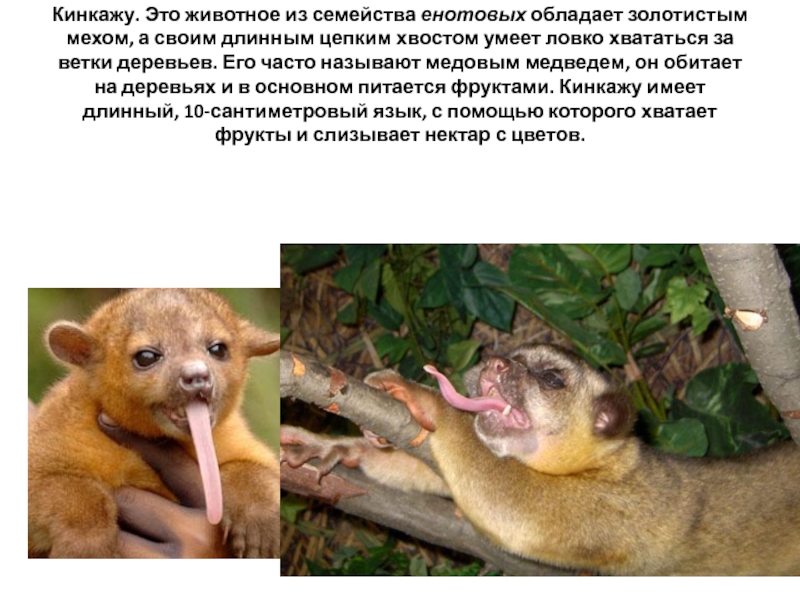 Слайд 28Кинкажу. Это животное из семейства енотовых обладает золотистым мехом, а своим длинным цепким