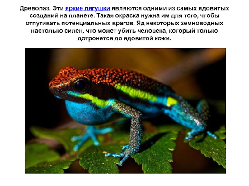 Слайд 32Древолаз. Эти яркие лягушки являются одними из самых ядовитых созданий на планете. Такая