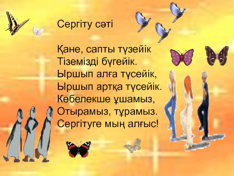 Сергіту сәтіҚане, сапты түзейікТіземізді бүгейік.  Ыршып алға түсейік,Ыршып артқа түсейік.Көбелекше ұшамыз, Отырамыз, тұрамыз.Сергітуге мың алғыс!