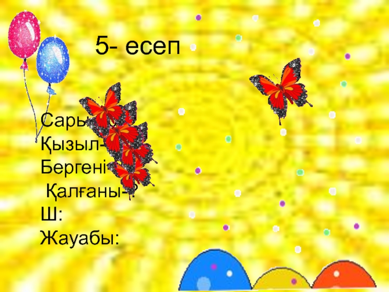 5- есепСары-10Қызыл-12Бергені-2 Қалғаны-?Ш:Жауабы: