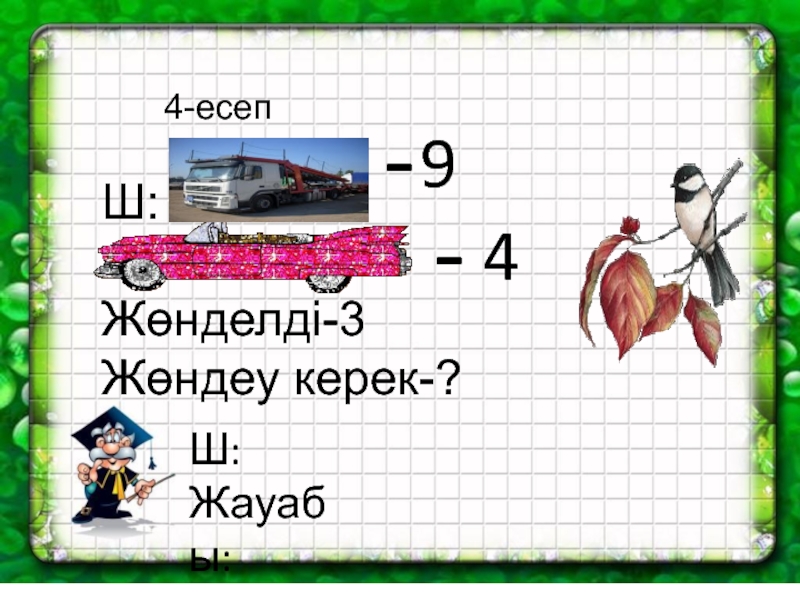 Мақсаты: 1. Білімділік.4 санын қосу және азайту бойынша білімдерін тиянақтау, екі амалмен шығарылатын есептер шығаруға үйрету.2.Дамытушылық. Оқушылардың