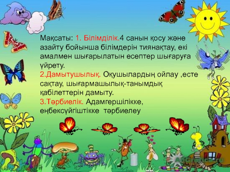 Слайд 2Мақсаты: 1. Білімділік.4 санын қосу және азайту бойынша білімдерін тиянақтау, екі