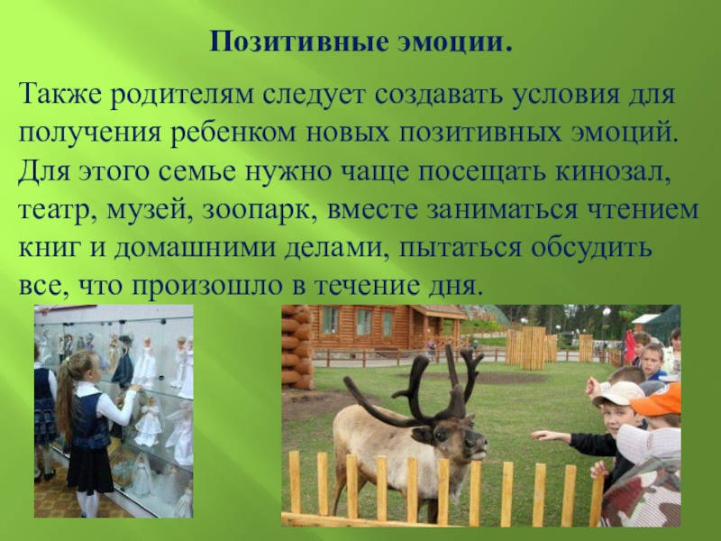 эмоций. Для этого семье нужно чаще посещать кинозал, театр, музей, зоопарк, вместе заниматься чтением книг и домашними делами, пытаться обсудить все, что произошло в течение дня.