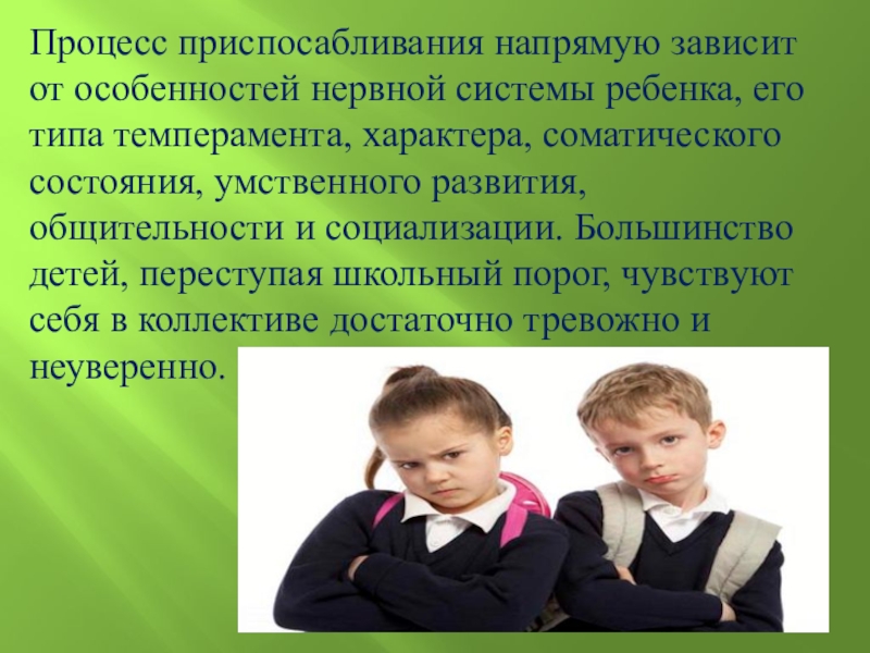 Слайд 4Процесс приспосабливания напрямую зависит от особенностей нервной системы ребенка, его типа