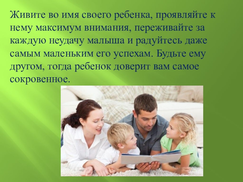 Слайд 23Живите во имя своего ребенка, проявляйте к нему максимум внимания, переживайте