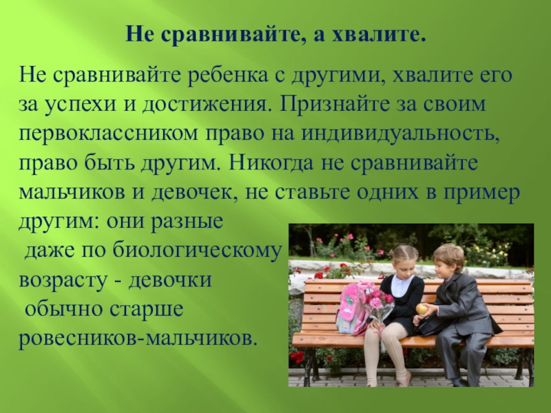 успехи и достижения. Признайте за своим первоклассником право на индивидуальность, право быть другим. Никогда не сравнивайте мальчиков и девочек, не ставьте одних в пример другим: они разные