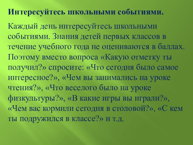 классов в течение учебного года не оцениваются в баллах. Поэтому вместо вопроса «Какую отметку ты получил?» спросите: «Что сегодня было самое интересное?», «Чем вы занимались на уроке чтения?», «Что веселого было на уроке физкультуры?», «В какие игры вы играли?», «Чем вас кормили сегодня в столовой?», «С кем ты подружился в классе?» и т.д.