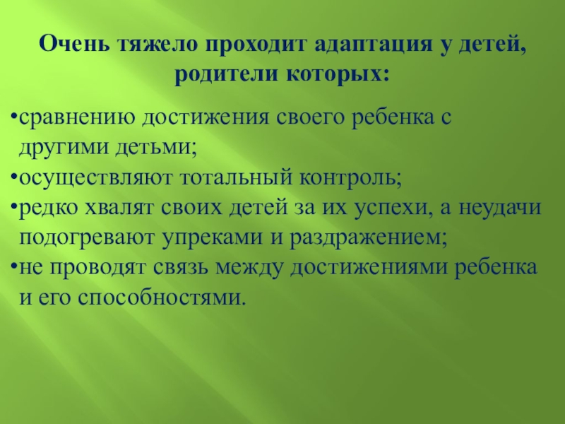 Слайд 5Очень тяжело проходит адаптация у детей, родители которых: