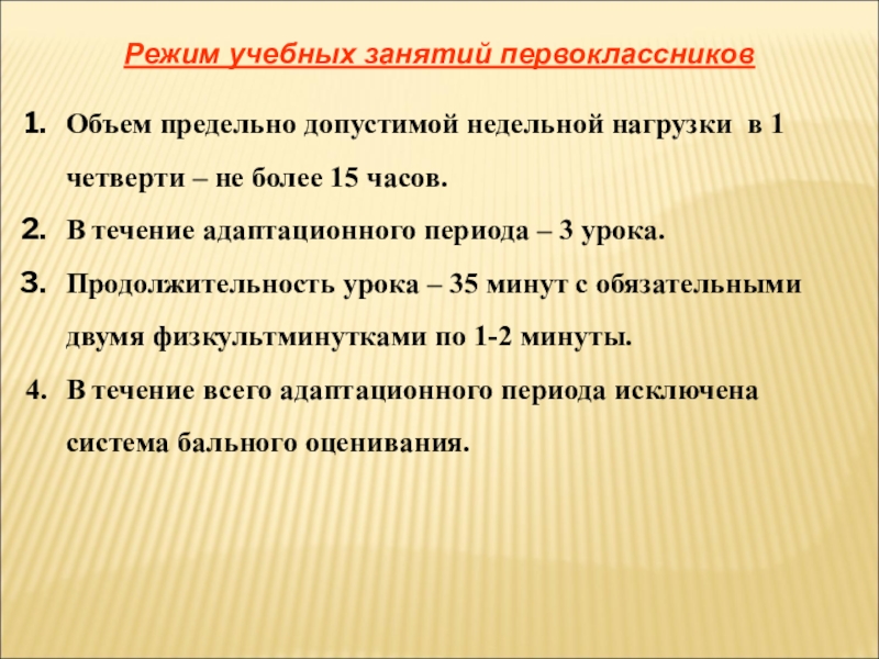 Режим учебных занятий первоклассниковОбъем предельно допустимой недельной нагрузки в 1 четверти – не более 15 часов.В течение