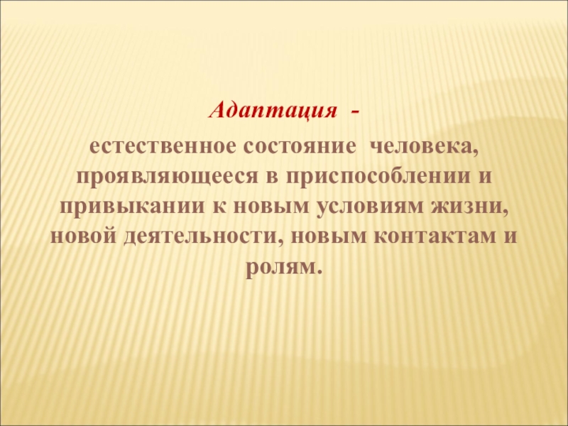 Адаптация -естественное состояние человека, проявляющееся в приспособлении и привыкании к новым условиям жизни, новой деятельности, новым контактам