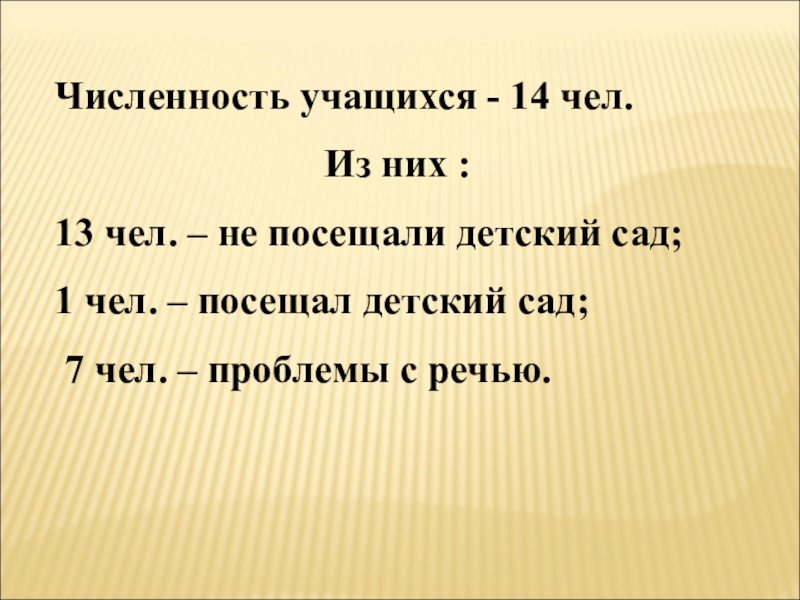 Численность учащихся - 14 чел. Из них :13 чел. – не посещали детский сад; 1 чел. –