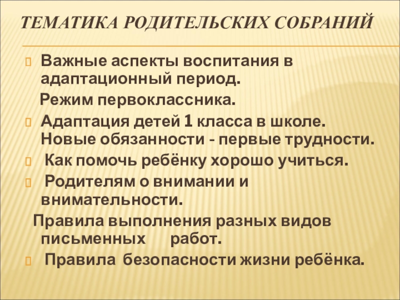 ТЕМАТИКА РОДИТЕЛЬСКИХ СОБРАНИЙВажные аспекты воспитания в адаптационный период.  Режим первоклассника.Адаптация детей 1 класса в школе. Новые