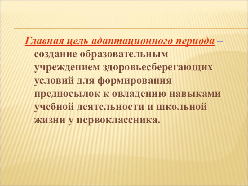 Главная цель адаптационного периода – создание образовательным учреждением здоровьесберегающих условий для формирования предпосылок к овладению навыками учебной