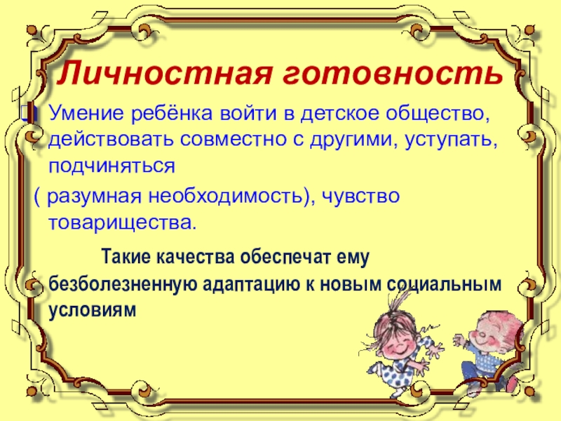 Умение ребёнка войти в детское общество, действовать совместно с другими,