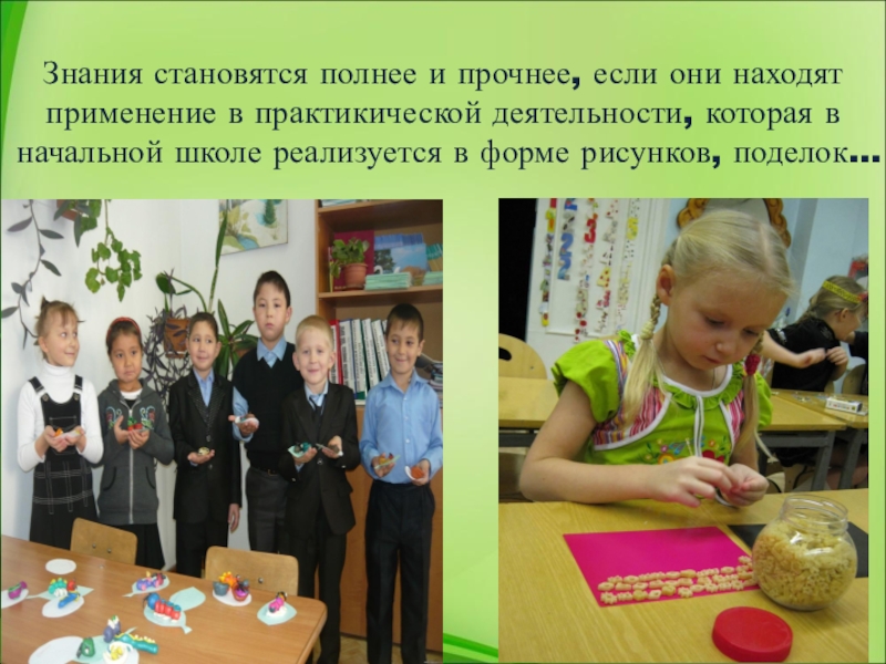 Знания становятся полнее и прочнее, если они находят применение в практикической деятельности, которая в начальной школе реализуется