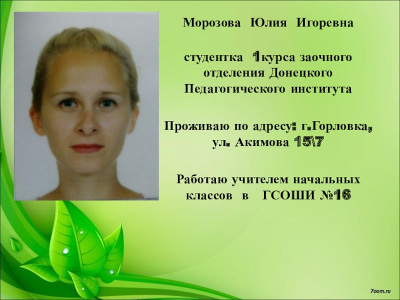 Морозова Юлия Игоревна студентка 1курса заочного отделения Донецкого Педагогического институтаПроживаю по адресу: г.Горловка, ул. Акимова 15\7Работаю учителем