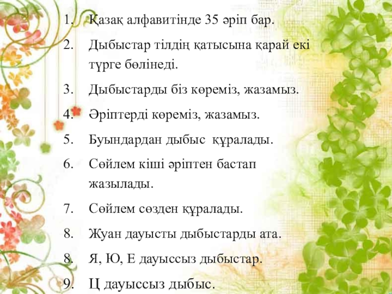 (дауысты, дауыссыз, жуан, және жіңішке дауыстылар) ажырату және дұрыс дыбыстау.