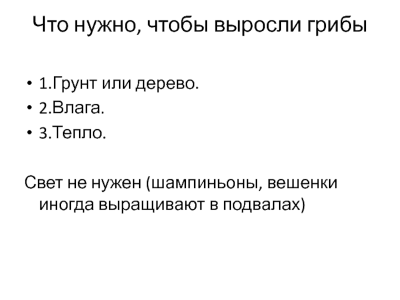 Что нужно, чтобы выросли грибы 1.Грунт или дерево.2.Влага.3.Тепло.Свет не нужен (шампиньоны, вешенки иногда выращивают в подвалах)