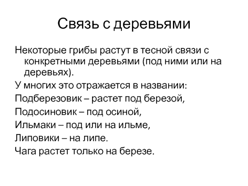 Связь с деревьямиНекоторые грибы растут в тесной связи с конкретными деревьями (под ними или на деревьях). У