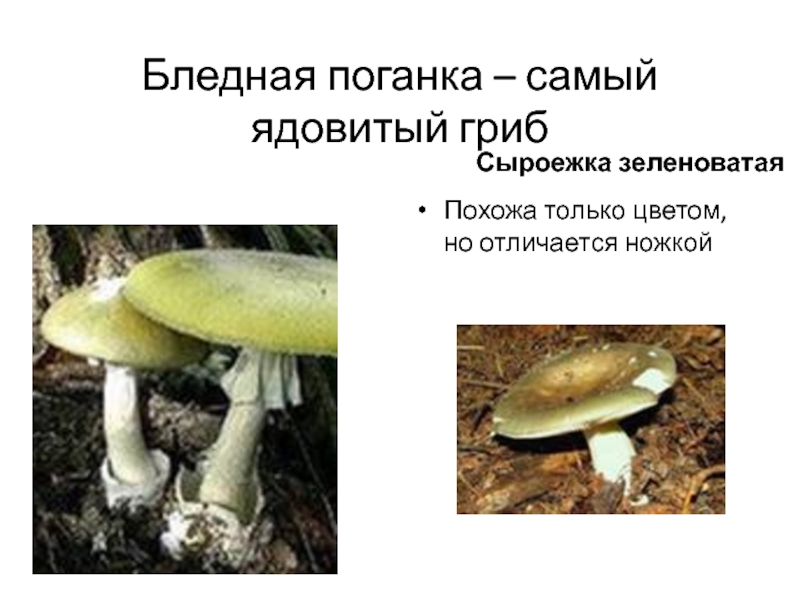 Бледная поганка – самый ядовитый грибСыроежка зеленоватаяПохожа только цветом, но отличается ножкой
