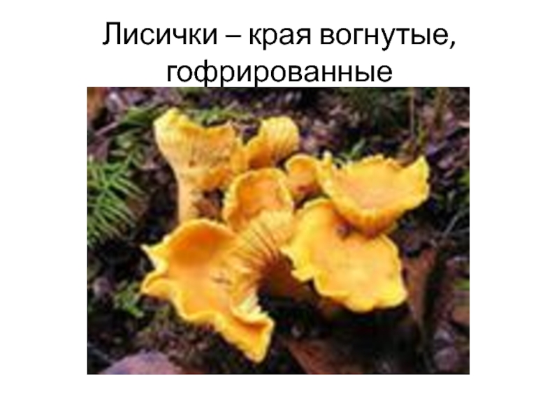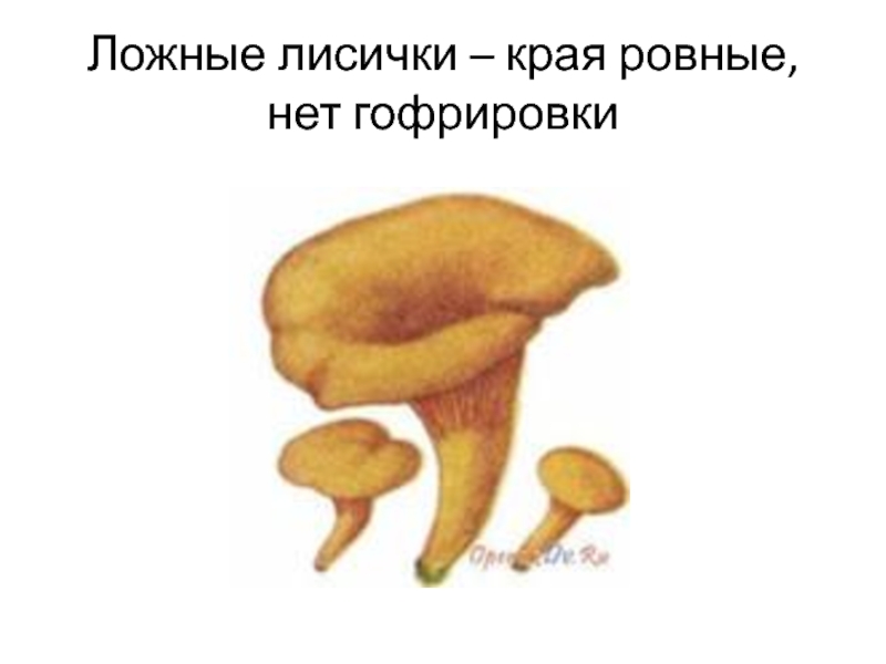 Слайд 26Ложные лисички – края ровные, нет гофрировки