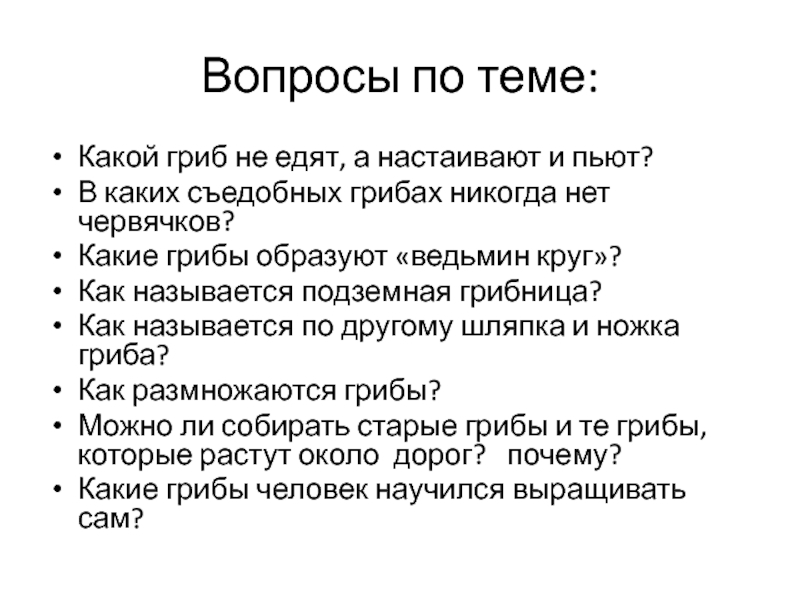 Вопросы по теме:Какой гриб не едят, а настаивают и пьют?В каких съедобных грибах никогда нет червячков?Какие грибы
