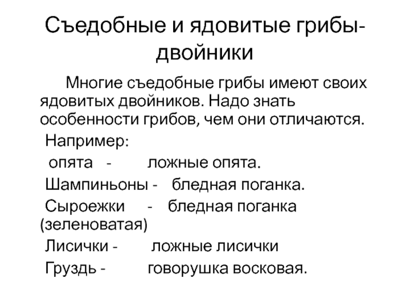 Съедобные и ядовитые грибы-двойники		Многие съедобные грибы имеют своих ядовитых двойников. Надо знать особенности грибов, чем они отличаются.	Например: