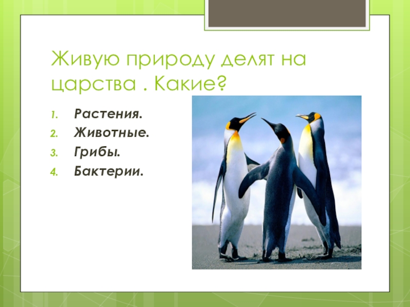 Слайд 3Живую природу делят на царства . Какие?