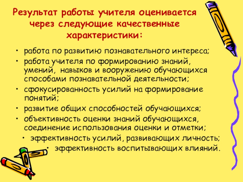 Слайд 32Результат работы учителя оценивается через следующие качественные характеристики: