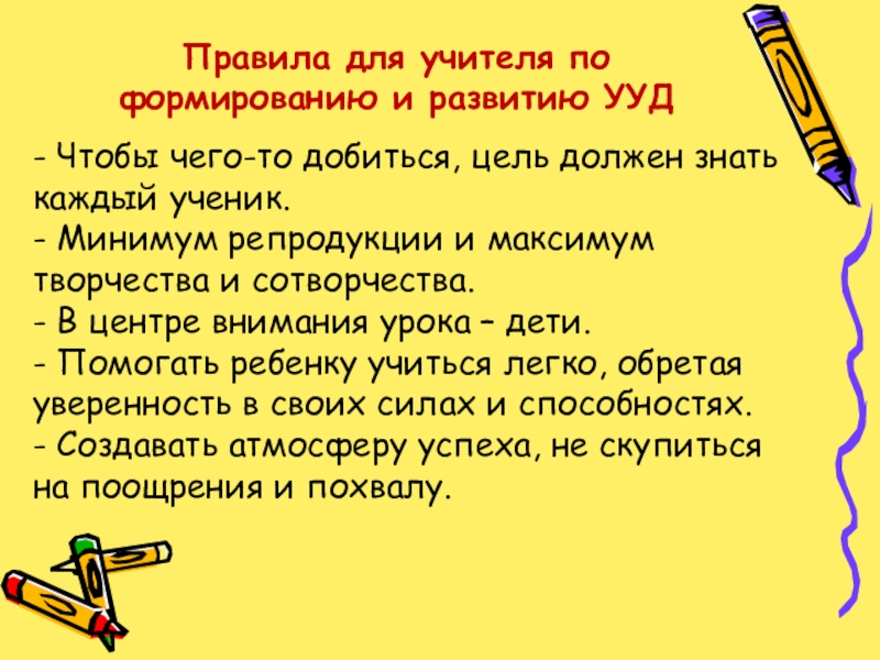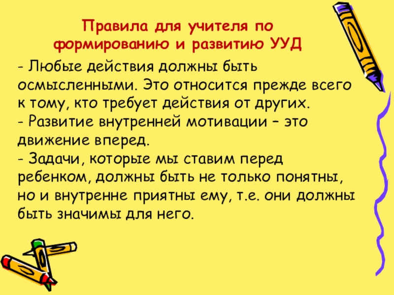 Слайд 28Правила для учителя по формированию и развитию УУД