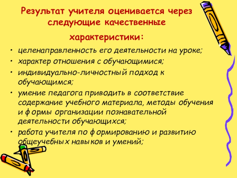 Слайд 31Результат учителя оценивается через следующие качественные характеристики:
