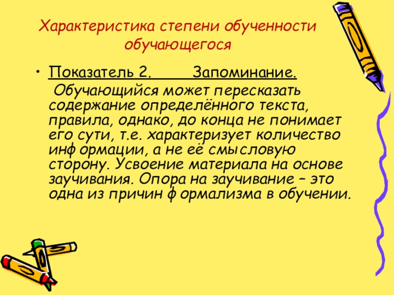 может пересказать содержание определённого текста, правила, однако, до конца не понимает его сути, т.е. характеризует количество информации, а не её смысловую сторону. Усвоение материала на основе заучивания. Опора на заучивание – это одна из причин формализма в обучении.