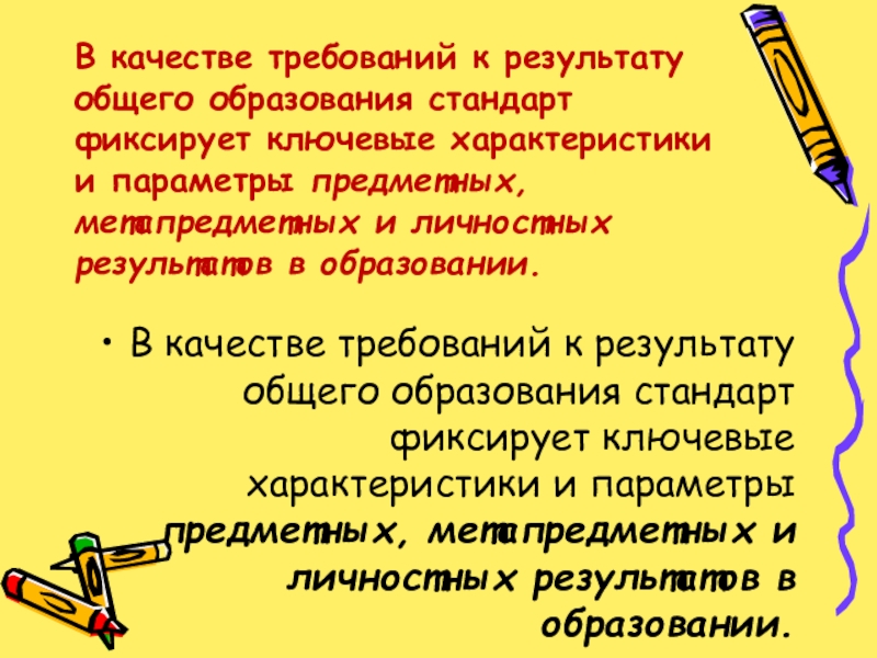 Слайд 11В качестве требований к результату общего образования стандарт фиксирует ключевые характеристики