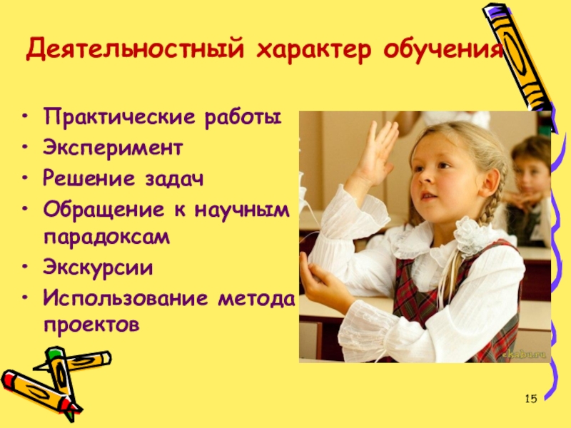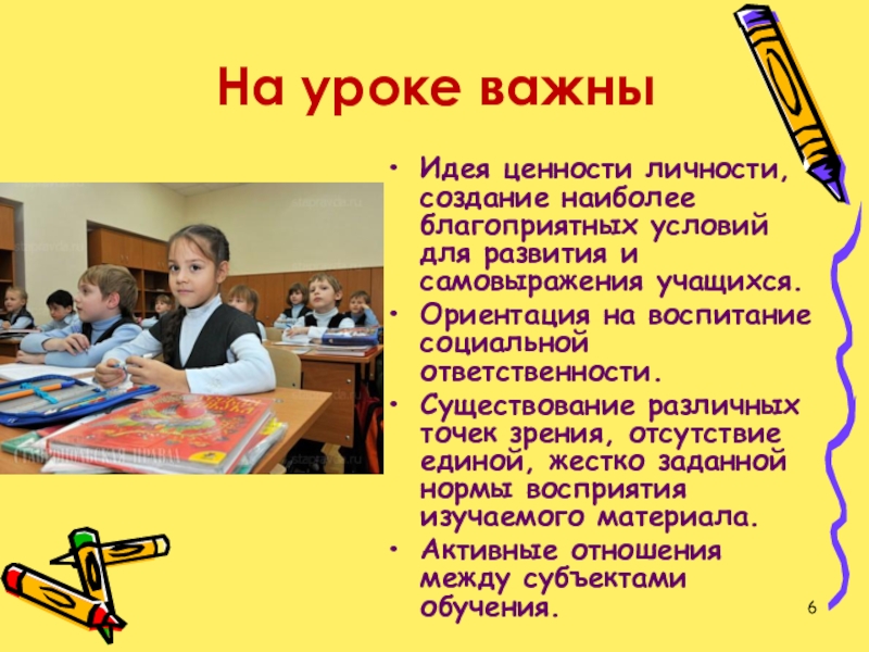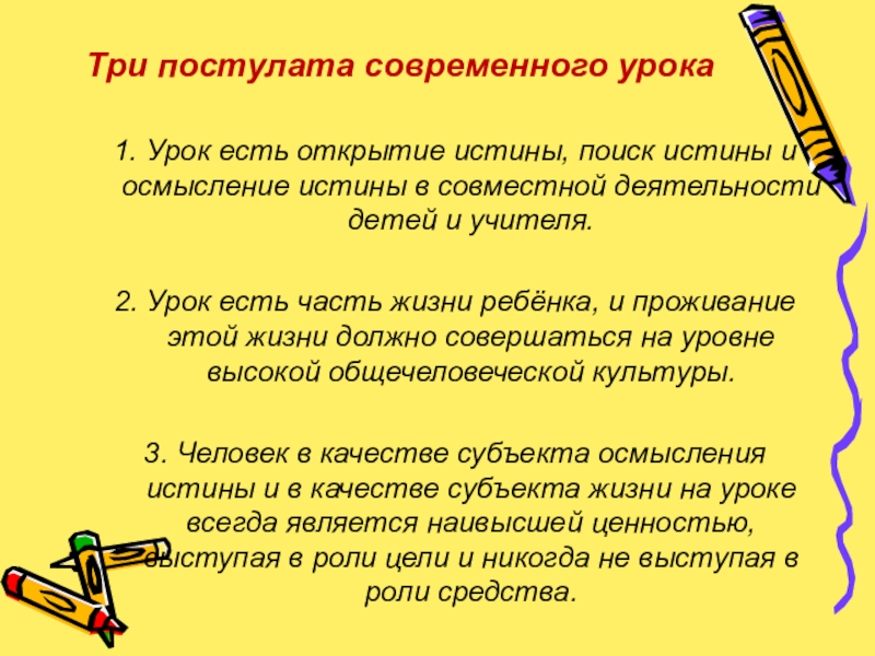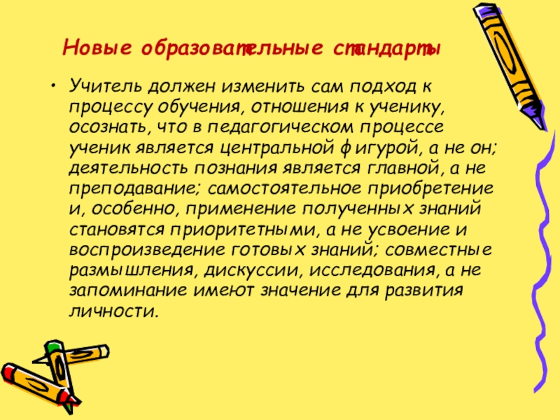 к ученику, осознать, что в педагогическом процессе ученик является центральной фигурой, а не он; деятельность познания является главной, а не преподавание; самостоятельное приобретение и, особенно, применение полученных знаний становятся приоритетными, а не усвоение и воспроизведение готовых знаний; совместные размышления, дискуссии, исследования, а не запоминание имеют значение для развития личности.