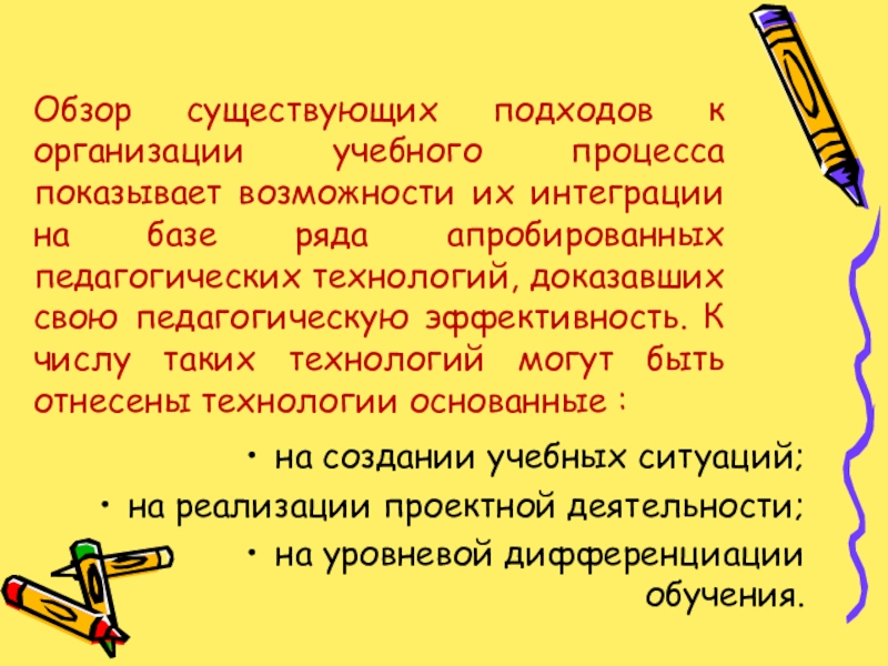 Слайд 45Обзор существующих подходов к организации учебного процесса показывает возможности их интеграции